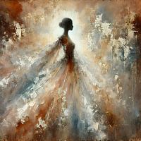 Ontdek de tijdloze elegantie van een abstract olieverfwerk dat de vrouwelijke vorm viert. Met rijke bruin- en goudtinten straalt dit werk warmte en luxe uit, terwijl de vloeiende lijnen van de jurk een gevoel van beweging en mysterie oproepen.