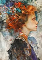 Dreamfire - Dit vrouwen schilderij toont een jonge vrouw met vurig oranje haar dat smelt in een collage van bloemen, vlinders en abstracte vormen, resulterend in een dromerig surrealistisch portret.