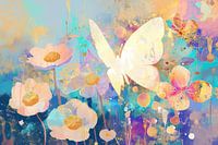 Dreamflight - Dit vlinder- en bloemen schilderij vertoont een levendige harmonie van doorschijnende vlinders en delicate bloemen, vermengd met abstracte kleurspatten en textuuraccenten in een droomachtige compositie.