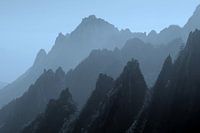Droomwereld van silhouetten, mist, nevel en wazige contouren in het bergmassief van de Gele Bergen (Yellow Mountains), China. Een mystiek dromerige bergwereld in blauwtinten, vlak voor zonsopgang (blauwe uur). Uitzichtpunt in Huangshan (Huang Shan). Dromerig natuurlandschap, berglandschap, ochtendsfeer, ochtendlicht. De blauwtonen…