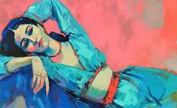 Dreaming Vivid - Dit vrouwen schilderij toont een relaxte, dromerige vrouw liggend met haar hoofd op haar arm, afgebeeld in opvallende blauw- en roodtinten met een expressieve, bijna abstracte penseelstreek.