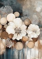 Dreaming in Blooms - Dit bloemen_schilderij toont een verzameling van grote, weelderige witte bloemen met donkere centra, omgeven door abstracte bruine en gouden cirkels op een achtergrond van grijze, blauwe en beige tinten, die samen een dromerige en serene indruk geven.