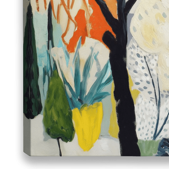 Een levendig abstract schilderij van een boslandschap, een mix van krachtige penseelstreken, dynamische boomvormen en een opvallend kleurenpalet variërend van diep blauw en rood tot helder geel en wit. Het kunstwerk vangt de essentie van de natuur in een dromerige, moderne stijl.