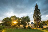 De zonsondergang achter de bomen. Tussen de bomen staat een idyllisch kasteeltje op het veld. Een fraai en heuvelachtig landschap in Frankrijk.