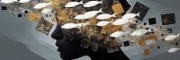 Dreamstream - Dit abstracte vrouwen schilderij illustreert een silhouet profiel van een vrouw met een veelheid aan zwevende witte visvormen en fragmentarische gouden en zwarte elementen tegen een grijsachtige achtergrond, die een gevoel van droomachtige verstrooidheid oproept.