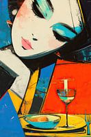 Dreamy Dine - Dit vrouwen schilderij toont een expressief portret van een jonge vrouw met gesloten ogen en een tafereel met een glas wijn en een bord, weergegeven in een krachtige pop-art stijl met heldere primaire kleuren en gedurfde zwarte contouren.