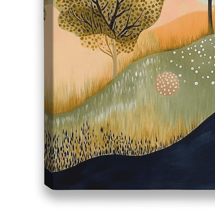 Dreamy Dots - Dit landschap schilderij toont gestileerde heuvels en bomen met een rijk palet van geel, blauw en oranje, en gedetailleerde texturen door punten en stippen.