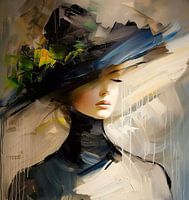 Dreamy Silence - Dit vrouwen schilderij toont een elegant portret van een jonge vrouw met een grote hoed, uitgevoerd in een dynamische abstracte stijl met levendige penseelstreken en contrasterende kleuraccenten.