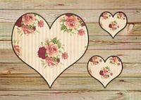Drei Herzen mit Rosen motiv auf rustikalen Holz,im Shabby Chic style.