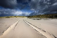 Dreigende luchten aan de kust, waar de meeuwen tussen de windmolens door vliegen. De zon breekt net even door en schijnt over het strand en de duinen.