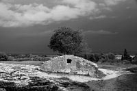 Een dreigende wolken lucht. De zon schijnt van de andere kant en verlicht de boom en het muurtje. Daardoor ontstaat er een scheur contrast. De foto is genomen in de buurt van Arles in Frankrijk.