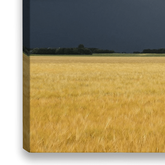 Dreigende onweerslucht met op de voorgrond een door de zon beschenen korenveld.