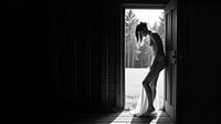 In deze sfeervolle creatie staat een topless dame in een halfopen deuropening van een houten cabin. Het beeld vangt het moment van overgang tussen donker en licht: binnen heerst de schaduw, terwijl buiten een helder landschap met bomen lonkt. Het lichaam wordt vanuit het zachte buitenlicht belicht, waardoor een gracieuze contour…