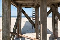 Palenfundatie van het Drenkelingenhuisje op het Noordzeestrand van Terschelling met op de achtergrond de oude palenfundatie van het oude huisje