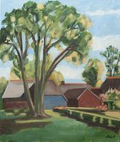 Drents landschap is gemaakt tijdens een werkweek in Belt Schutsluis in Drente, plein air. oftewel op lokatie, wat mij opviel die enorme groote boom voor de huizen. Origineel verkocht USA.