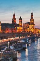 Blick ueber die Elbe zur Bruehlschen Terrasse zum Staendehaus, Hausmannsturm und katholischen Hofkirche (von links nach rechts), Dresden, Sachsen, Deutschland, Europa