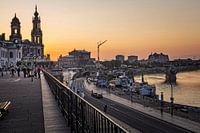 Bekende voetgangers promenade in historisch Dresden langs de rivier de Elbe bij ondergaande zon (Saksen, Duitsland).