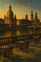 Dresdens Avond Elegantie ontvouwt zich langs de rustige oevers van de Elbe, waar licht en architectuur elkaar in perfecte balans ontmoeten. De Frauenkirche en de barokke skyline staan trots onder de ondergaande zon, hun weerspiegelingen strekken zich uit over het kalme water. Lege cafétafels rusten rustig op de voorgrond, aangeraakt door de laatste amberkleurige stralen - een zachte echo van Edward Hopper's fascinatie voor stille momenten en menselijke afwezigheid als aanwezigheid.