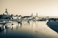 Dresden met de Onze-Lieve-Vrouwekerk, het Brühlterras, het residentiepaleis, de hofkerk, het Semper Operagebouw en schepen op de Elbe, Saksen, Duitsland - monochroom