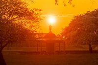 Klokkenspelpaviljoen aan de oever van de Elbe in Neustadt 's avonds