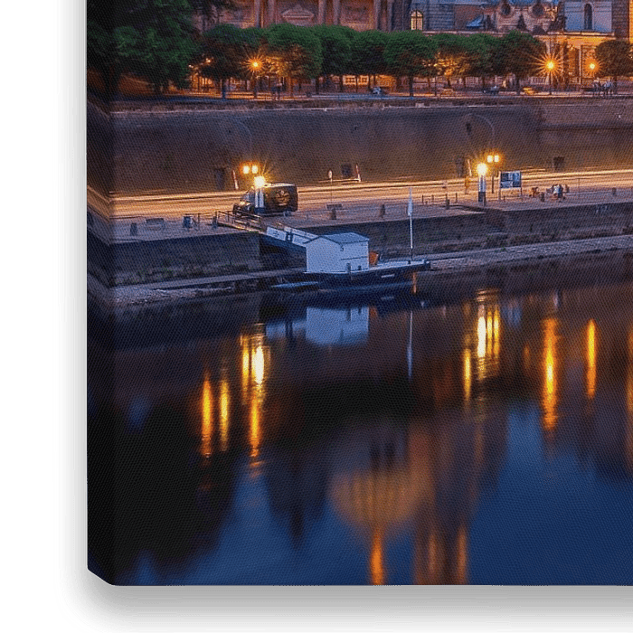 Avondopname van de Duitse stad Dresden aan de Elbe rivier. De stad is verlicht en gereflecteerd in het water.