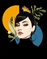 Digitaal vervaardigd portret van een mooie, modebewuste vrouw in zwarte kleding, op een achtergrond van bloemen en bladeren, kleuren en vormen.