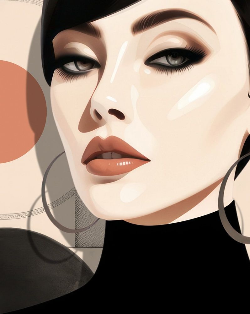 Digitaal vervaardigd portret van een mooie, modebewuste vrouw in zwarte kleding, op een achtergrond van vormen en kleuren.