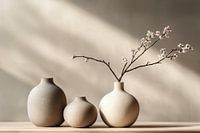 Deze kunstfoto vat de essentie van rust en eenvoud met een zorgvuldige compositie van drie aardewerken vazen in aardetinten, waarvan twee versierd met delicate takken met subtiele witte bloesems. De zachte schaduwen en minimalistische vormgeving ademen een serene, verstilde schoonheid uit die zowel esthetisch als emotioneel aansprekend is.