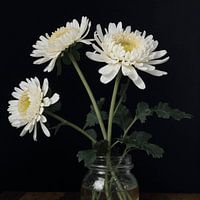 Drie witte madeliefjes in een eenvoudige glazen pot tegen een donkere achtergrond. Dit stilleven benadrukt de puurheid en elegantie van de natuur.
