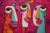 Drie Gezichtsprofielen | Colorful Conversations Together - Dit is een abstract schilderij met drie kleurrijke gezichten die op een levendige achtergrond staan, waardoor ze een speelse en unieke uitstraling hebben; de gezichten zijn expressief met opvallende levendige kleuren zoals roze, turquoise en oranje, wat een moderne kunst…