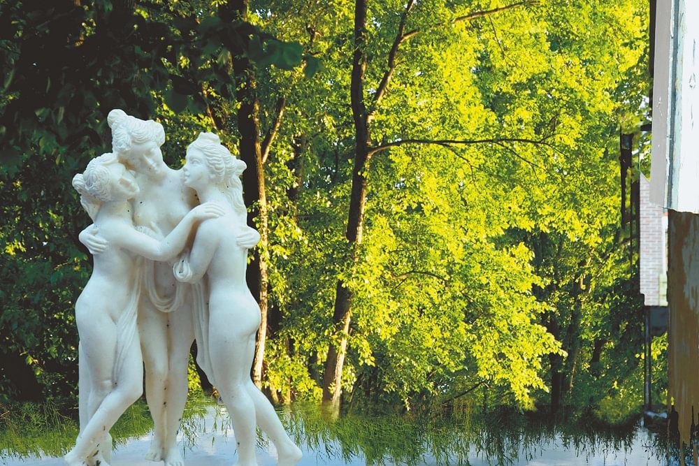 De afbeelding toont een surrealistisch tafereel. Drie Gratiën omhelzen elkaar en lijken te zweven op een waterplas in een sprookjesachtig bos. Dit tafereel wordt omlijst door een afbrokkelende bakstenen muur. Je kijkt als het ware stiekem door de opening naar dit melancholische tafereel, met alle schoonheid en rust die het bos te bieden heeft.