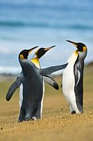 Koningspinguin (Aptenodytes patagonicus) trio aan de kust, Falklandeilanden. © MP / Nature in Stock