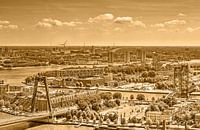 Een monochroom-beeld in sepiatinten met daarop drie bekende Rotterdamse bruggen (en dan eens niet de Erasmusbrug) Links vooraan een pyloon van de Willemsbrug, rechts voormailge spoorbrug de Hef en op de achtergrond de van de verkeersinformatie bekende Van Brienenoordbrug. Verder zijn op de foto de wijken Noordereiland, Feijenoord,…