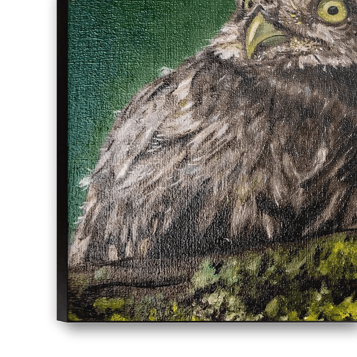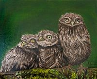 De uil staat al sinds de Griekse oudheid symbool voor wijsheid. Daarom vind ik het zo leuk dat deze drie kuikens zo schaapachtig voor zich uit zitten te staren. Het werk geeft een gevoel van rust, maar door de details kun je er uren naar blijven kijken. Heb je bijvoorbeeld het vliegje op de middelste uil al gespot?