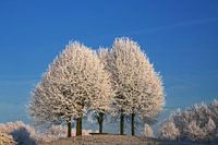 Drie besneeuwde bomen bij zonsopkomst. De sneeuw op de takken is bevroren waardoor dit een sprookjesachtig effect geeft. De bomen staan op een heuvel en steken zo mooi af bij de ijsblauwe lucht