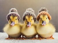 Drie schattige donzen eendjes op een rij, met gebreide wollen mutsjes op hun kopje. Het beeld is met behulp van ai gegenereerd.
