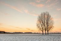 een winterlandschap van drie bomen in de sneeuw tijdens zonsondergang