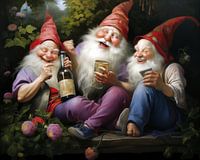 Portret van drie oude tuinkabouters aan de borrel, vrolijk abstract fantasie portret.