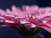 De scherpte van de foto ligt op de druppels en is klein, waardoor de rest van de Gerbera vaag wordt.