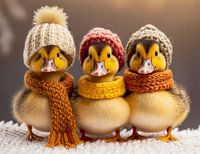 Drie eendjes staan naast elkaar, ze hebben alle drie een wollen muts op en een sjaal om. Het beeld is met behulp van ai gegenereerd.