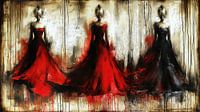 Dit kunstschilderij toont drie stijlvolle vrouwen die poseren in lange, vloeiende rode en zwarte jurken. De elegantie van hun poses contrasteert met de ruwe, getextureerde achtergrond, die diepte en textuur aan het schilderij toevoegt. Het kleurenpalet van gedurfd rood en diep zwart benadrukt de vrouwelijke kracht en gratie, terwijl de subtiele textuur op de achtergrond de moderne en hedendaagse aard van het kunstwerk benadrukt. Deze compositie straalt luxe, vertrouwen en verfijning uit en nodigt de kijker uit om te genieten van de schoonheid van mode en artistieke expressie.