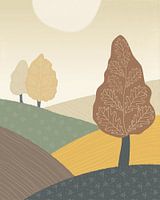 Minimalistisch herfstlandschap met velden, drie gestileerde bomen en de zon hoog boven alles. De velden en bomen zijn versierd met grafische elementen, en texturen breken de kleurvlakken op en geven de illustratie een speels tintje. De kleuren zijn typische voor de herfst: varianten van beige, bruin, groen en geel plus antraciet.