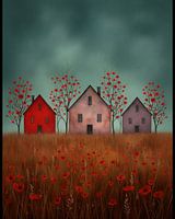 Drie stille gestalten tegen de wind, Stilstaand aan de rand van de tijd, Met ramen als zware, gesloten ogen Over een veld van klaprozen en zuchten. De aarde brandt met een oeroud rood, Terwijl de lucht, in haar vermoeide groen, Rust op de daken als een onuitgesproken geheim. Geen voetstap klinkt, geen stem is te horen, Alleen het…