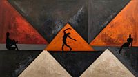 De achtergrond, een spel van licht en schaduw binnen de driehoekige vlakken, benadrukt de diepte en complexiteit van deze interactie. De kleurrijke harmonie en de krachtige vormen creëren een boeiend visueel ritme dat de kijker uitnodigt om de diepere lagen van interpretatie te verkennen.
