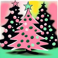 Beeld je in dat je door een betoverend winterlandschap dwaalt, en daar ontmoet je drie kerstbomen die je hart verwarmen. In deze speelse en abstracte stijl zijn de kerstbomen als levendige dansers, gehuld in roze, mintgroen en zwart. Ze lijken bijna te zweven, omringd door een betoverende gloed van kleuren.