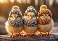 Drie schattige kleine gele kuikentjes, met wollen mutsjes en sjaals, op een koude winterdag. De schattigheid straalt er van af, zo lief. Het beeld is met behulp van ai gegenereerd.