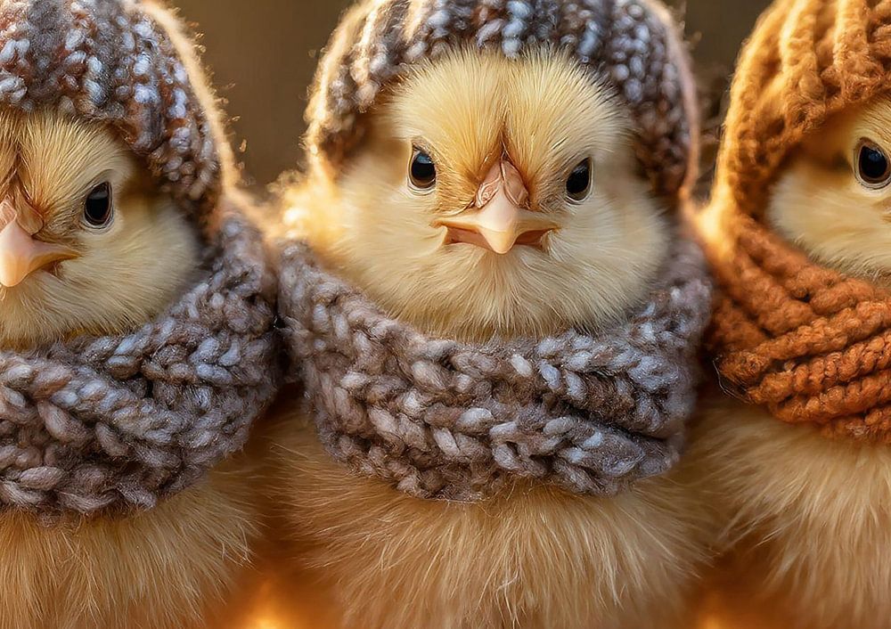 Drie schattige kleine gele kuikentjes, met wollen mutsjes en sjaals, op een koude winterdag. De schattigheid straalt er van af, zo lief. Het beeld is met behulp van ai gegenereerd.