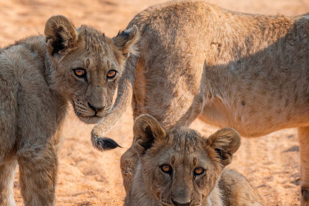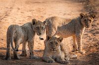 Deze prachtige foto toont drie jonge leeuwenwelpen die rustig op een stoffige zandweg in de Afrikaanse savanne staan en liggen. De drie welpen zijn alert en nieuwsgierig, met hun grote ogen gericht op de camera. Hun vacht heeft een zachte, goudbruine kleur die perfect opgaat in de warme tinten van hun omgeving. De textuur van hun vacht is duidelijk zichtbaar, met fijne details die hun jeugdige pluizigheid benadrukken.