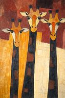 Drie giraffen zijn afgebeeld in gestileerde vorm met langgerekte halzen en karakteristieke patronen. De achtergrond in warme aardetinten benadrukt hun unieke uiterlijk.