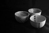 Drie kleine, fragiele kommetjes van aardewerk. Voorzien van kleine tekeningen en versieringen. Doen wat Oosters of Japans aan. Ik heb ze bij elkaar gezet en als groepje gefotografeerd. De foto heb ik omgezet naar zwart wit.